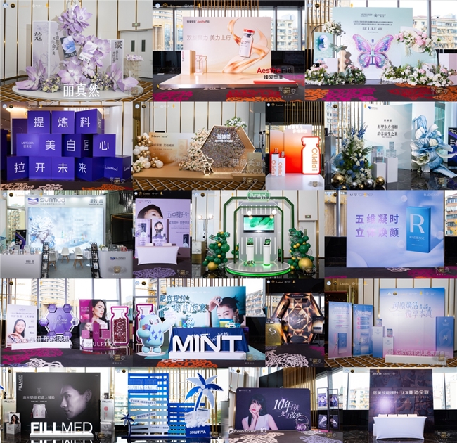 图中由左往右依次是:丽真然、臻爱塑菲、优法兰、提美拉、薇旖美、爱唯缇、芮丽塑·女娲、缇致·晶、海雅美、塑妍真、RADIESSE、GALDERMA、秘特、欣可丽美学、珂芮绮、FILLMED、舒媞雅、艾尔建美学、彬适·全联